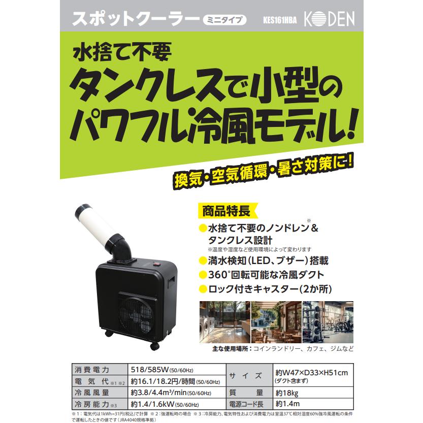 | 商品の特徴 | KODEN 広電 KES161HBA ミニスポットクーラー スポットクーラー。在庫有・即納】ミニスポットクーラー ノンドレン KES161HBA ミニ。楽天市場】【エントリーで期間限定P10倍】 KODEN 広電 KES161HBA ミニ。360度首振り機能を搭載した小型ノンドレン冷風機。未使用新品 タンスのゲン スポットクーラー 家庭用【猛暑対応モデル。KES161HBA ミニスポットクーラー 1個 広電(KODEN) 【通販モノタロウ。- モデル名: KES161HBA- 冷風機能: ノンドレン方式- 色: ブラック- 消費電力: 350W- 風量調整: 360度首振り- LED表示: あり- サイズ: 小型購入後、一度試運転したのみです。 | ||